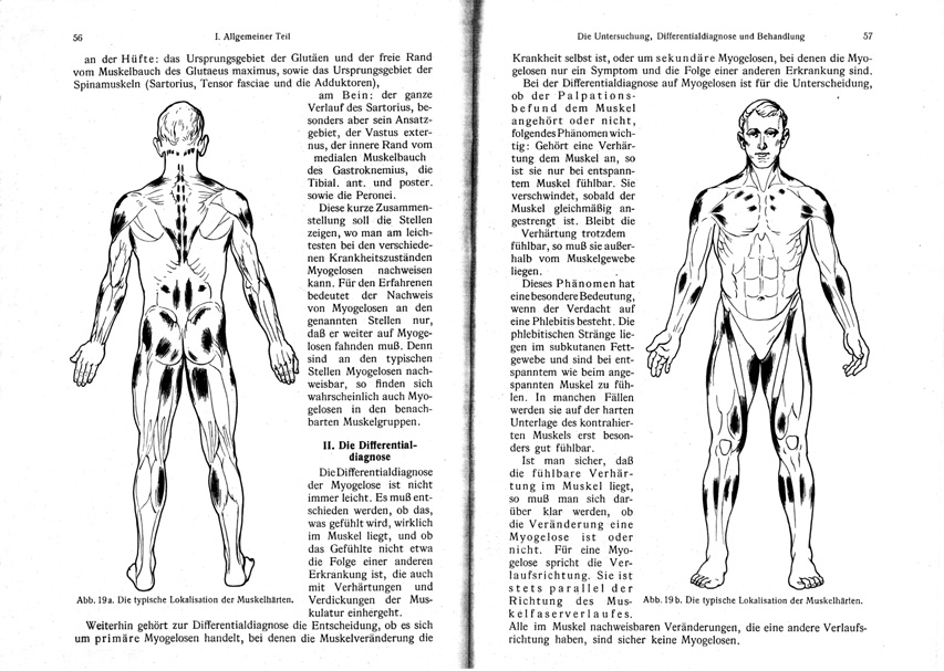 The first is a German book by Max Lange, Die Muskelhärten (Myogelosen): Ihre Entstehung und Heilung. (Muscle calluses [lumps]: their origin and cure) from 1931. I believe Lange was not a physician but some kind of physiotherapist, but his descriptions are extensive. If one compares his illustrations with my drawings above I think the similarities are rather striking: