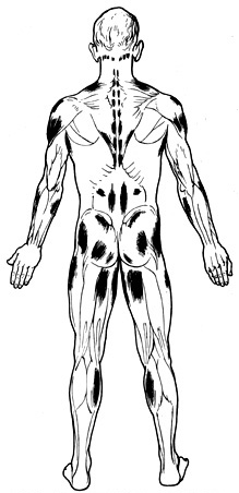It would be interesting to hear if anyone reading this recognizes these symptoms. The drawings below show the various kinds of sore points, lumps and hard "plates" that I have in my muscles. The blue areas are tender lumps that sometimes can be removed by massage or static pressure. They always re-appear, however. Their exact position differs slightly from time to time, while the areas marked in red and green are in most cases located to the same spots also when they re-appear.